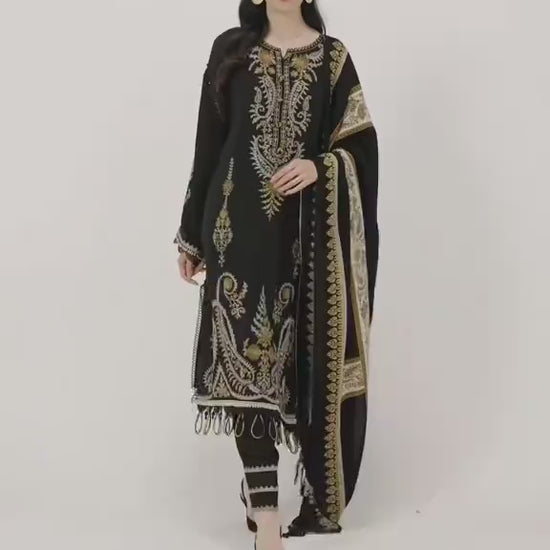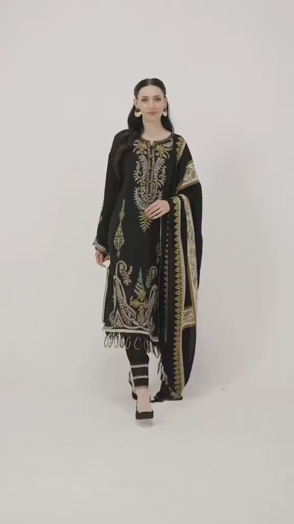 Dark Luxe Embroided 3-piece Suit with Pashmina wool Printed Shawl
