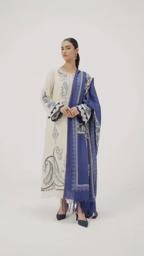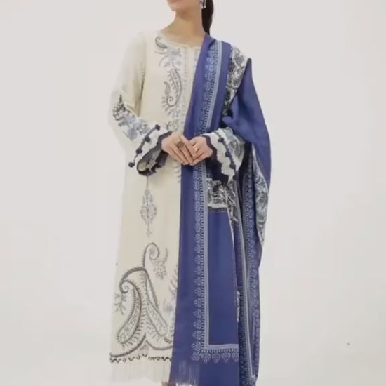 Celestial White Embroided 3-piece Suit with Slub wool Printed Shawl